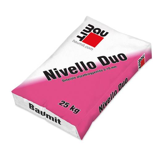 A Baumit Nivello Duo-t hideg, tiszta vízhez öntjük, majd lassú járású keverővel átkeverjük, amíg egy csomómentes, homogén masszát nem kapunk (keverési idő kb. 2-3 perc). A feldolgozhatósági idő 20°C-on kb. 30 perc, ett ől alacsonyabb hőmérsékleten hosszabb, magasabb hőmérsékleten rövidebb. A már bekevert anyagot semmilyen esetben sem szabad vízzel visszahígítani. Ne adjunk a termékhez egyéb adalékszert (pl. fagyásgátló, kötésgyorsító).