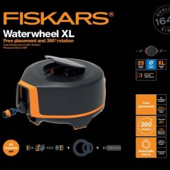 A Fiskars XL automata tömlődob szett all-inclusive, használatra kész öntözőkészlet , amely tartalmaz strapabíró locsolótömlőt, tömlődobot, állítható öntözőfejet és csatlakozókat.