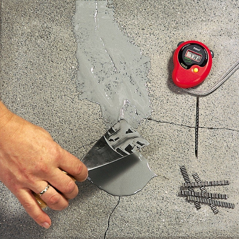 Az első esetben elég a repedéseket kitölteni egy epoxi gyantával, mint pl. az EPOJET. Dilatációs repedések észlelésekor minden esetben „betonvarrás” technológiát kell alkalmaznunk! A repedést 2-3 mm mélységig ki kell tágítanunk, keresztirányban 25-30 cm-enként az aljzatvastagság feléig bevágásokat kell készítenünk. Portalanítás után a bevágásokba esztrich-kötőlemezt helyezünk, és az egészet kitöltjük EPORIP-pel. A gyantába még friss állapotában kvarchomokot szórunk. Az utolsó, ám egyik legfontosabb lépés, hogy megszüntessük a hibát kiváltó okot: bevágjuk a megfelelő helyre a dilatációt! Enélkül a repedésünk újra meg fog jelenni!