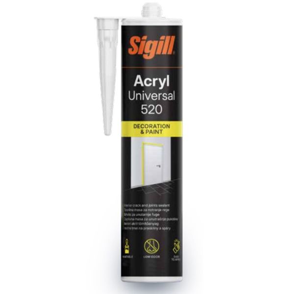 A SIGILL Acryl Universal 520 ideális beltéri hézag- és repedéstömítéshez, csatlakozási rések, nyílászárók, lépcsők és fal-mennyezet metszéspontok javításához, valamint olyan helyeken, ahol kisebb mértékű mozgás várható.